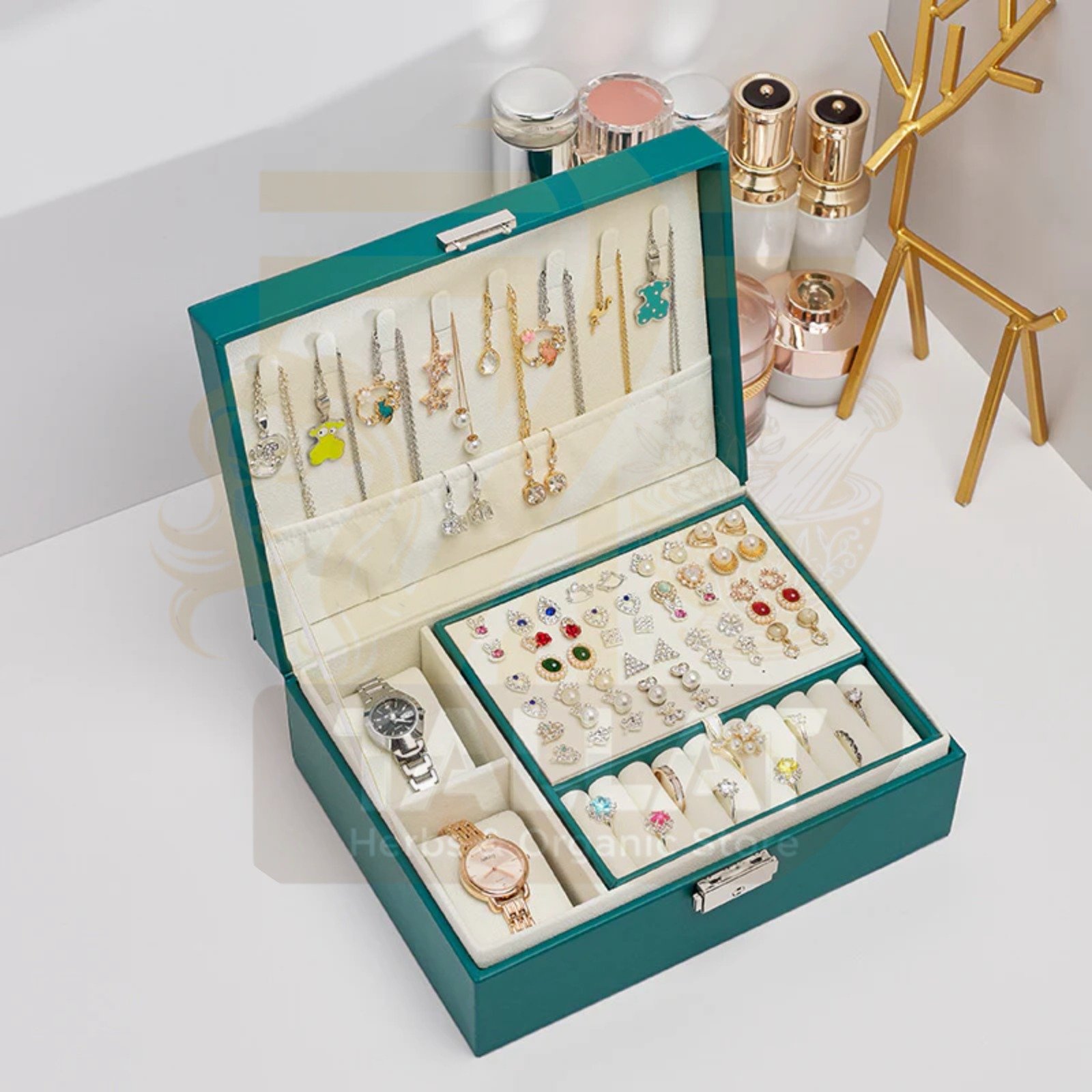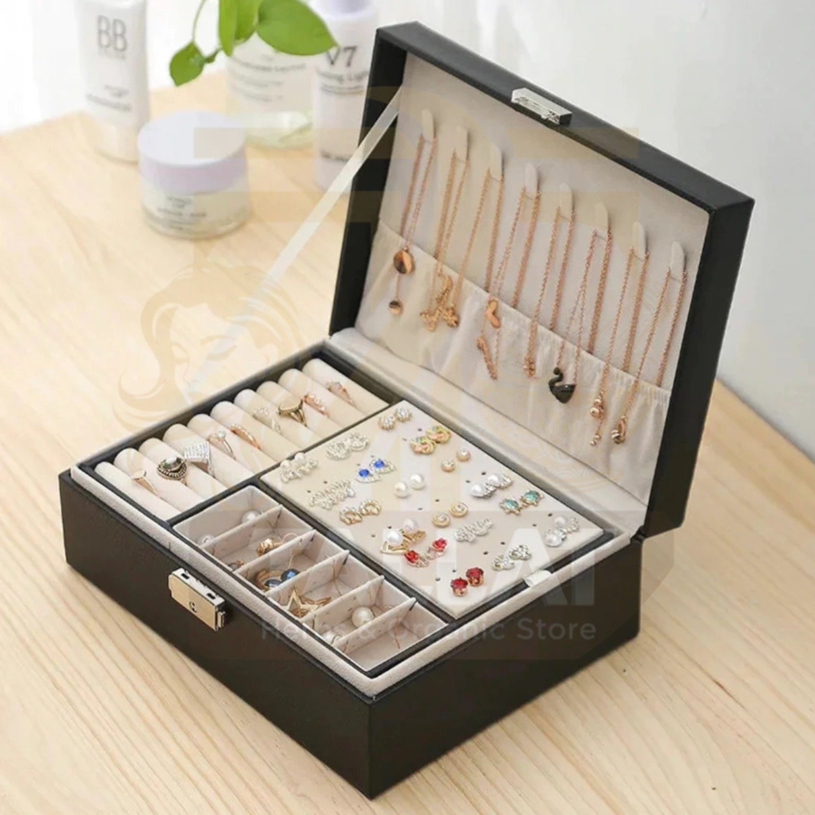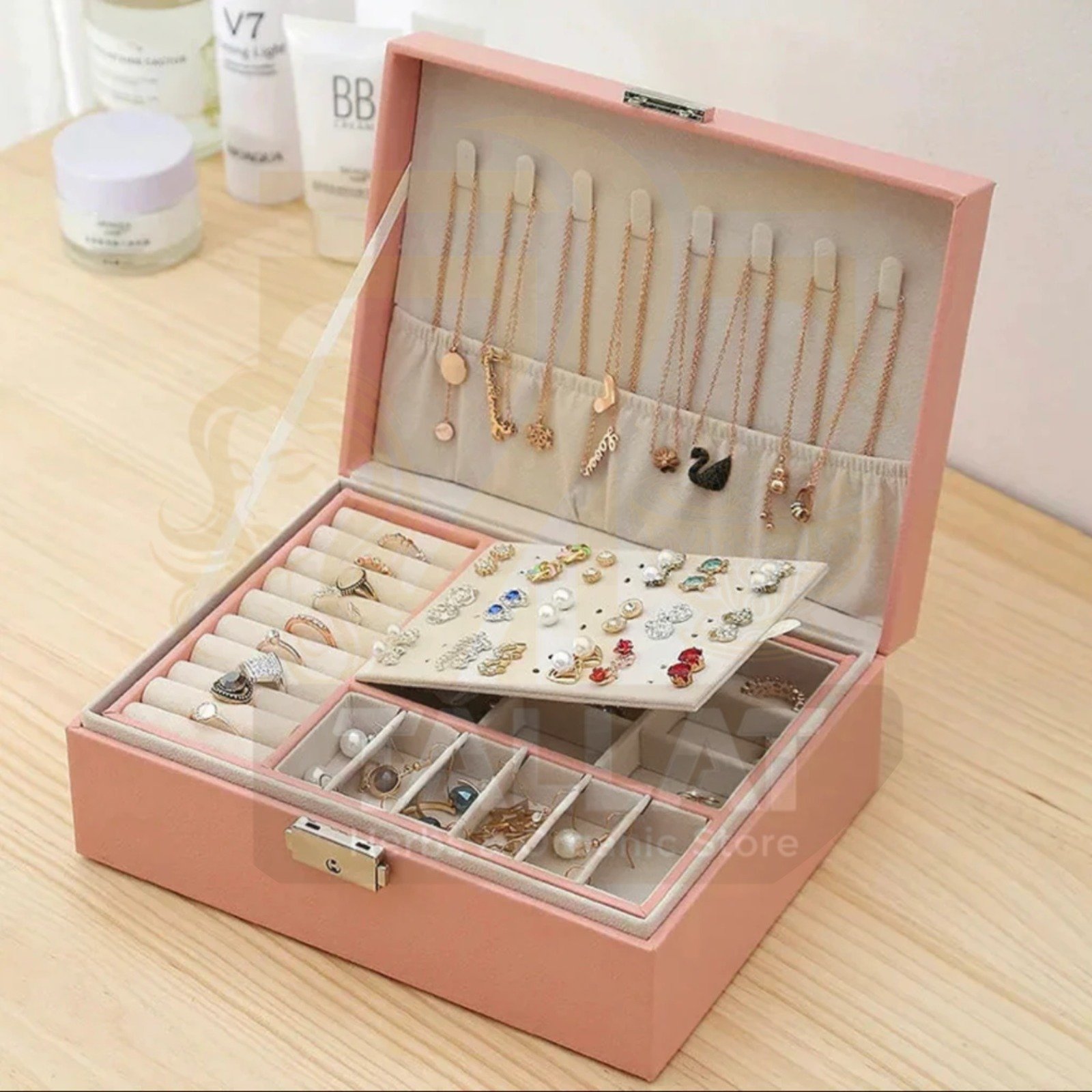 Jewellery Organizer Box ek stylish aur functional storage solution hai jo jewellery ko safe aur organized rakhta hai. Is mein multiple compartments hote hain.